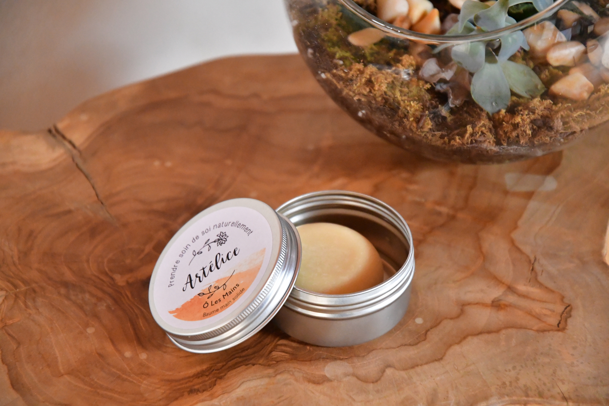Baume solide « Ô Les Mains » – Artélice. Livré avec boîte métallique pour le transport.