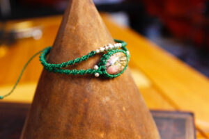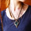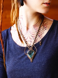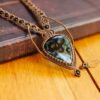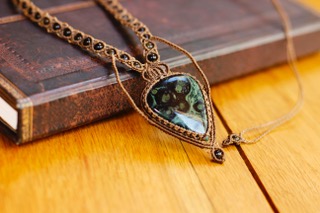 Collier composé de fils de polyester entourant un cabochon de Jaspe Kambaba.